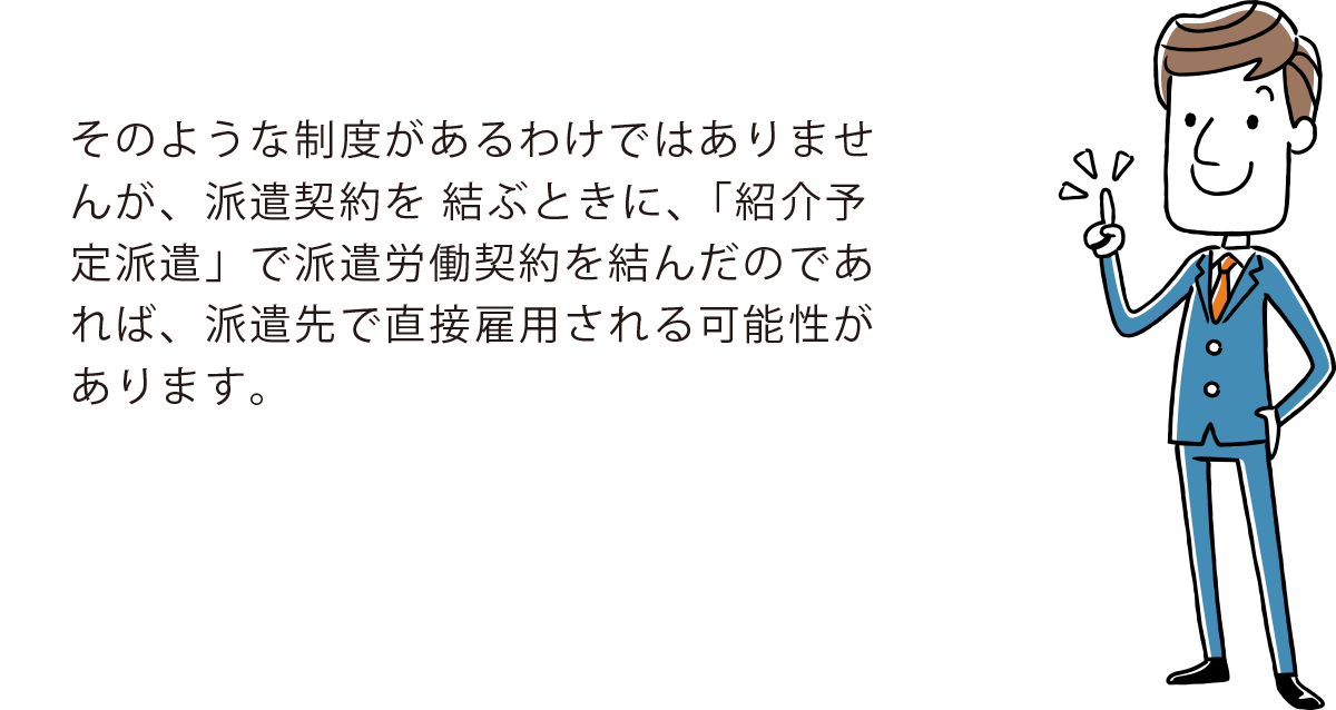 このように、紹介予定派遣で派遣労働契約を結んだ場合であっても、 6ヶ月後に必ず派遣先に直接雇用されるとは限りません。また、派遣先が 派遣労働者を直接雇用する場合であっても、必ずしも正社員として雇用し なければならないというものではなく、例えば3ヶ月間の有期雇用などで もよいことになっています。 ただし、6ヶ月間の労働者派遣の受入れ期間と、3ヶ月程度の直接雇用 期間を繰り返す場合などのように、派遣受入期間の制限を免れる目的で紹 介予定派遣を利用していると考えられるときは、是正指導の対象となる場 合があります。