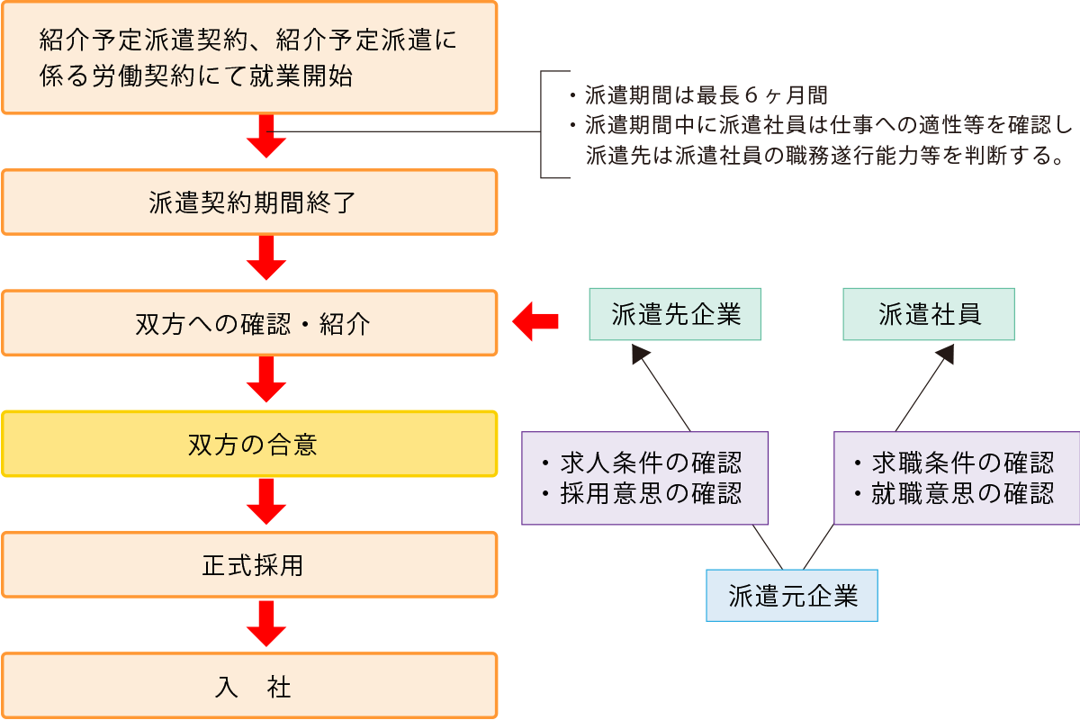 紹介予定派遣とは、派遣の開始前または開始後に、派遣元が、派遣労働 者及び派遣先に対して職業紹介することを予定して派遣就業させるという ものです(派遣法第2条第6号)。 紹介予定派遣制度を活用することによって、派遣労働者は、派遣先の仕 事の内容や会社の雰囲気を理解した上で就職することができ、派遣先は労 働者の適性、能力をじっくり見極めた上で、その労働者を直接雇用するか どうかを判断することができるというメリットがあります。 紹介予定派遣の場合は、派遣期間は6ヶ月を超えてはなりません(派遣 元指針第2の12(1)、派遣先指針第2の18(1))。